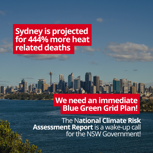 Sydney is heading for a climate emergency on its doorstep. The Federal Government’s National Climate Risk Assessment, released on 15 September 2025, makes it clear: our cities will heat up drastically, sea levels will rise, and the risk of flooding will escalate. Yet the NSW Government continues to grant new rights to developers and urban sprawl—pouring fuel on the climate fire—while failing to deliver the most basic adaptation measure Sydney needs: a comprehensive Blue-Green Grid.